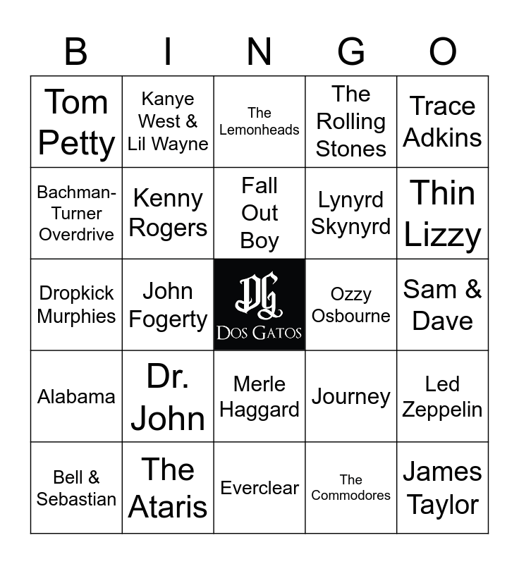This bingo card has a free space and 33 words: Bruce Springsteen, AC/DC, John Fogerty, The White Stripes, Alabama, Kenny Rogers, Trace Adkins, Bell & Sebastian, Kanye West & Lil Wayne, Soundgarden, Fall Out Boy, The Lemonheads, The Outfield, Blues Traveler, Ozzy Osbourne, Thin Lizzy, The Ataris, Dropkick Murphies, Dr. John, Journey, Merle Haggard, Whiskey Falls, Tom Petty, Sam & Dave, Everclear, James Taylor, The Rolling Stones, Lynyrd Skynyrd, Bachman-Turner Overdrive, Led Zeppelin, Bob Seger, The Commodores and Kool & the Gang.