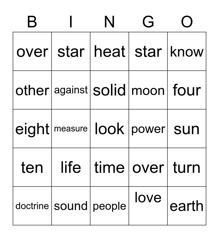 This bingo card has 25 words: life, people, solid, doctrine, know, over, other, star, power, time, moon, eight, over, turn, against, earth, sun, heat, four, measure, look, sound, ten, star and love.