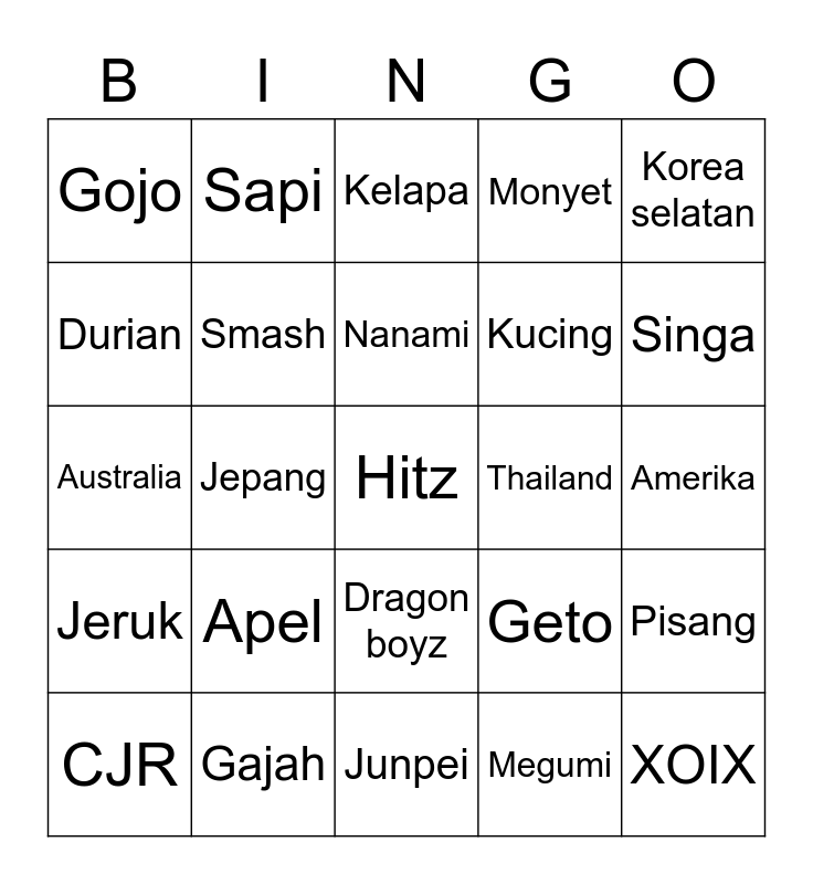 This bingo card has a free space and 24 words: Apel, Gajah, Nanami, CJR, Korea selatan, Gojo, Durian, Sapi, Thailand, Dragon boyz, Kucing, Australia, Geto, Pisang, Smash, Megumi, Amerika, Kelapa, Singa, Jepang, XOIX, Jeruk, Monyet and Junpei.