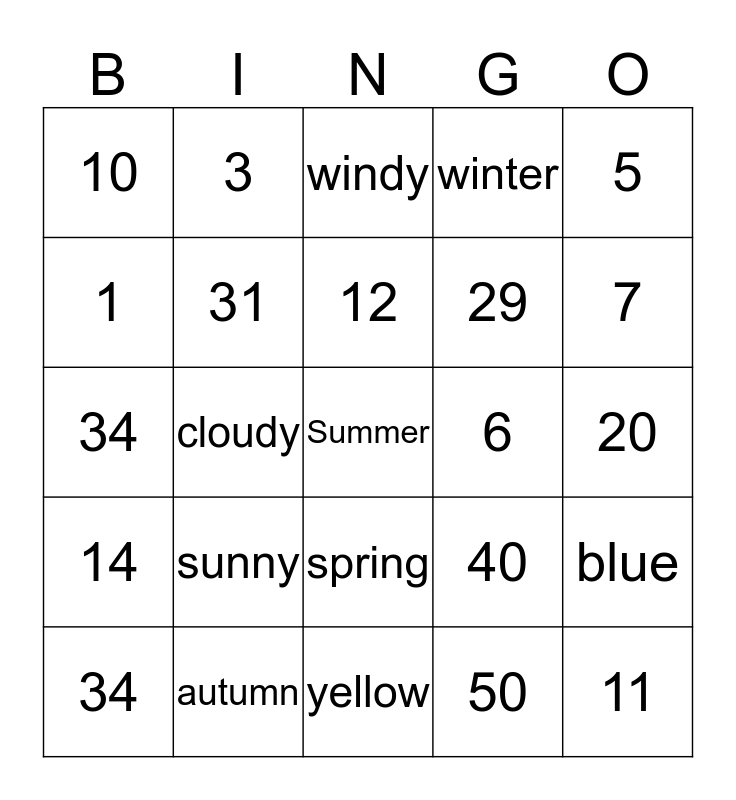 This bingo card has a free space and 24 words: sunny, autumn, 12, 34, 5, 10, 1, 3, 6, spring, 29, 34, 40, blue, 31, 50, 20, windy, 7, cloudy, 11, 14, winter and yellow.