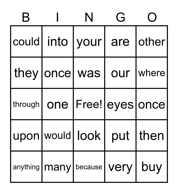 This bingo card has a free space and 29 words: anything, their, one, friends, could, your, once, would, eyes, many, once, buy, because, very, where, when, look, upon, other, through, put, have, our, they, are, into, then, was and every.