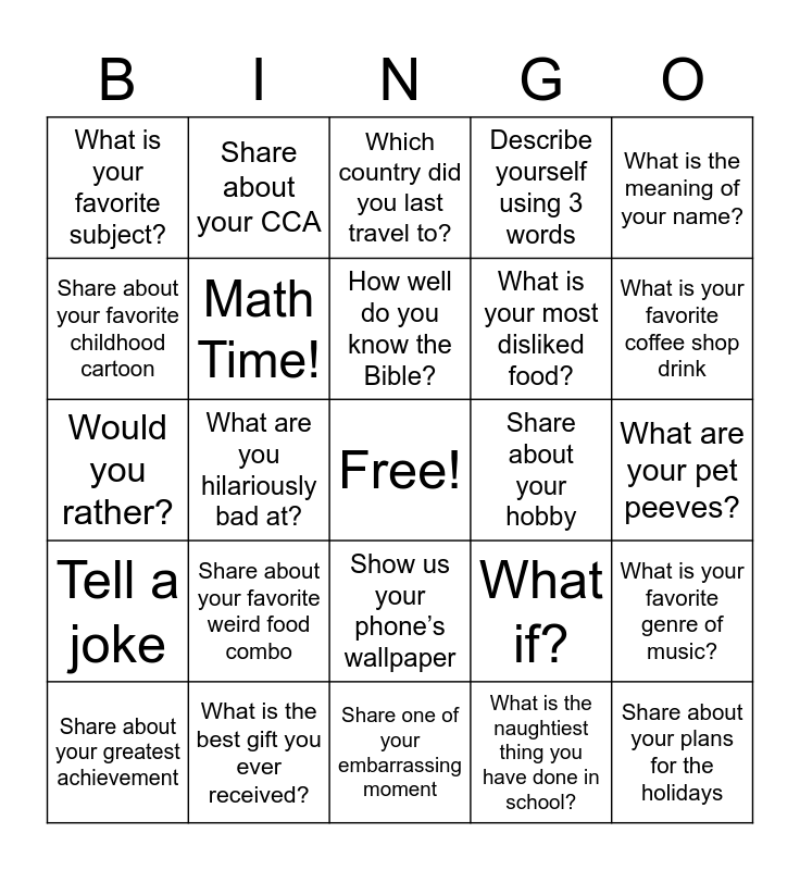 This bingo card has a free space and 24 words: Share about your greatest achievement, Share about your favorite weird food combo, How well do you know the Bible?, What is the naughtiest thing you have done in school?, What is the meaning of your name?, What is your favorite subject?, Share about your CCA, Which country did you last travel to?, Share about your hobby, What are your pet peeves?, Would you rather?, Math Time!, What if?, What is your favorite genre of music?, Share about your favorite childhood cartoon, What is the best gift you ever received?, Share one of your embarrassing moment, Describe yourself using 3 words, What is your favorite coffee shop drink, Tell a joke, What are you hilariously bad at?, Show us your phone’s wallpaper, What is your most disliked food? and Share about your plans for the holidays.