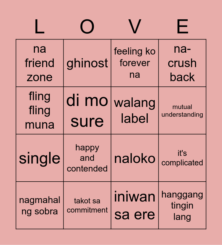 This bingo card has 20 words: nagmahal ng sobra, crush lang, feeling ko forever na, it's complicated, pinagpalit sa malapit, happy and contended, iniwan sa ere, na-crush back, single, ghinost, naloko, mutual understanding, na friend zone, takot sa commitment, walang label, in a relationship, fling fling muna, di mo sure, inlove and hanggang tingin lang.