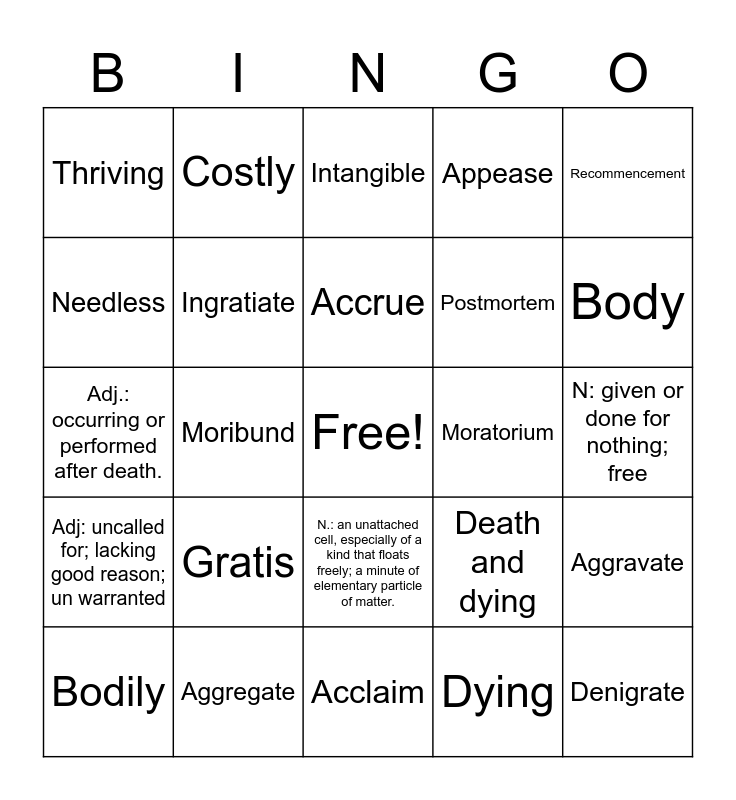 This bingo card has a free space and 51 words: Thankful or Thanks, Denigrate, Deprecate, Acclaim, Gratis, Complementary, Costly, Gratuitous, Needless, Indispensable, Ingratiate, Appease, Aggravate, Death and dying, Amortize, Reimburse, Accrue, Moratorium, Dormancy, Recommencement, Moribund, Dying, Thriving, Postmortem, Autopsy, Preceding, Body, Corporeal, Bodily, Intangible, Corpulent, Chubby, Thin, Corpuscle, Atom, Aggregate, Corpus, Collection, Segment, V: to criticize unfairly; to disparage; to deny the importance or validity of., N: given or done for nothing; free, Adj: uncalled for; lacking good reason; un warranted, V: bring oneself into favor with someone by flattering or trying to please them., V: to gradually write off the initial cost over a period; to reduce or pay off (a debt) with regular payments., N.: A suspension of an activity; a waiting period set by an authority., Adj.: describing a person or idea who is dying or near death., Adj.: occurring or performed after death., Adj.: of, relating to, or affecting the body; of the nature of the physical body; bodily., Adj.: fat; having a large bulky body., N.: an unattached cell, especially of a kind that floats freely; a minute of elementary particle of matter. and N.: a large or complete collection of writings..