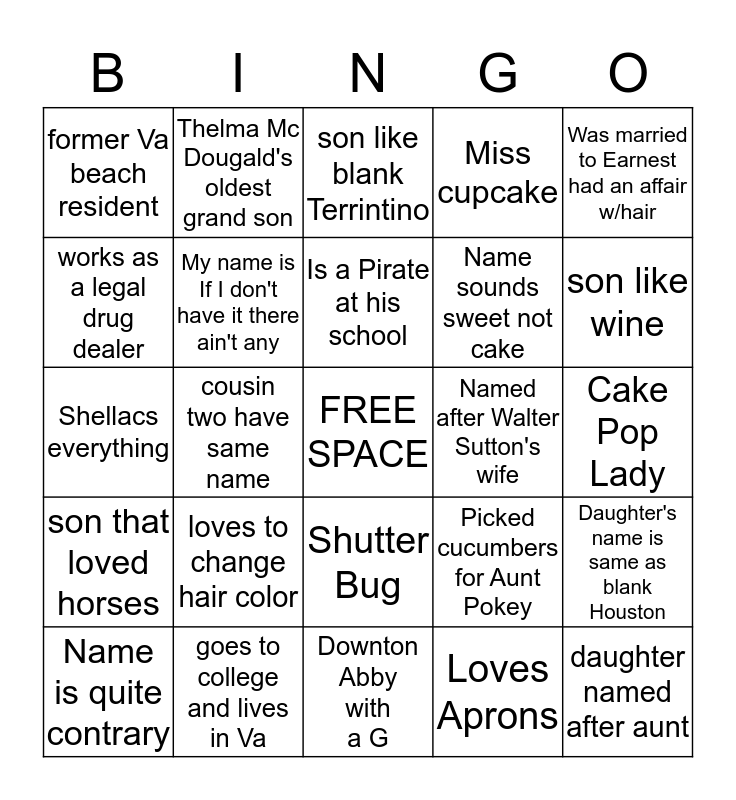 This bingo card has a free space and 24 words: loves to change hair color, goes to college and lives in Va, Is a Pirate at his school, Name is quite contrary, Was married to Earnest had an affair w/hair, former Va beach resident, works as a legal drug dealer, Thelma Mc Dougald's oldest grand son, Named after Walter Sutton's wife, Shutter Bug, Name sounds sweet not cake, Shellacs everything, Picked cucumbers for Aunt Pokey, Daughter's name is same as blank Houston, My name is If I don't have it there ain't any, Loves Aprons, Cake Pop Lady, son like blank Terrintino, son like wine, cousin two have same name, daughter named after aunt, son that loved horses, Miss cupcake and Downton Abby with a G.