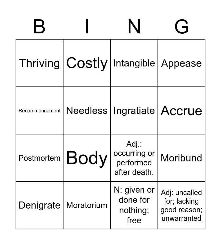 This bingo card has 51 words: Thankful or Thanks, Denigrate, Deprecate, Acclaim, Gratis, Complementary, Costly, Gratuitous, Needless, Indispensable, Ingratiate, Appease, Aggravate, Death and dying, Amortize, Reimburse, Accrue, Moratorium, Dormancy, Recommencement, Moribund, Dying, Thriving, Postmortem, Autopsy, Preceding, Body, Corporeal, Bodily, Intangible, Corpulent, Chubby, Thin, Corpuscle, Atom, Aggregate, Corpus, Collection, Segment, V: to criticize unfairly; to disparage; to deny the importance or validity of., N: given or done for nothing; free, Adj: uncalled for; lacking good reason; unwarranted, V: bring oneself into favor with someone by flattering or trying to please them., V: to gradually write off the initial cost over a period; to reduce or pay off (a debt) with regular payments., N.: A suspension of an activity; a waiting period set by an authority., Adj.: describing a person or idea who is dying or near death., Adj.: occurring or performed after death., Adj.: of, relating to, or affecting the body; of the nature of the physical body; bodily., Adj.: fat; having a large bulky body., N.: an unattached cell, especially of a kind that floats freely; a minute of elementary particles of matter. and N.: a large or complete collection of writings..