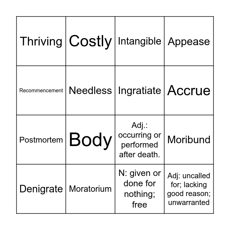 This bingo card has 51 words: Thankful or Thanks, Denigrate, Deprecate, Acclaim, Gratis, Complementary, Costly, Gratuitous, Needless, Indispensable, Ingratiate, Appease, Aggravate, Death and dying, Amortize, Reimburse, Accrue, Moratorium, Dormancy, Recommencement, Moribund, Dying, Thriving, Postmortem, Autopsy, Preceding, Body, Corporeal, Bodily, Intangible, Corpulent, Chubby, Thin, Corpuscle, Atom, Aggregate, Corpus, Collection, Segment, V: to criticize unfairly; to disparage; to deny the importance or validity of., N: given or done for nothing; free, Adj: uncalled for; lacking good reason; unwarranted, V: bring oneself into favor with someone by flattering or trying to please them., V: to gradually write off the initial cost over a period; to reduce or pay off (a debt) with regular payments., N.: A suspension of an activity; a waiting period set by an authority., Adj.: describing a person or idea who is dying or near death., Adj.: occurring or performed after death., Adj.: of, relating to, or affecting the body; of the nature of the physical body; bodily., Adj.: fat; having a large bulky body., N.: an unattached cell, especially of a kind that floats freely; a minute of elementary particles of matter. and N.: a large or complete collection of writings..
