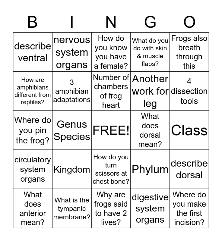 This bingo card has a free space and 24 words: Kingdom, What is the tympanic membrane?, Number of chambers of frog heart, What does anterior mean?, Frogs also breath through this, describe ventral, How are amphibians different from reptiles?, nervous system organs, What does dorsal mean?, How do you turn scissors at chest bone?, Another work for leg, Where do you pin the frog?, Phylum, describe dorsal, 3 amphibian adaptations, digestive system organs, Class, How do you know you have a female?, 4 dissection tools, Genus Species, Where do you make the first incision?, circulatory system organs, What do you do with skin & muscle flaps? and Why are frogs said to have 2 lives?.
