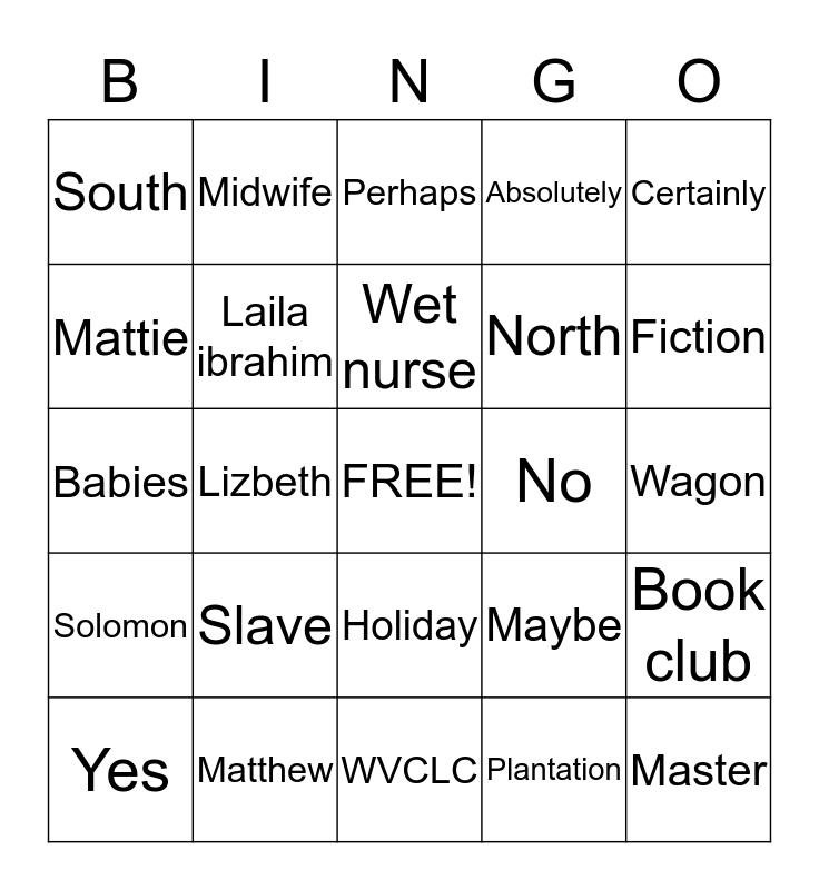 This bingo card has a free space and 24 words: Slave, Matthew, Wet nurse, Yes, Certainly, South, Mattie, Midwife, No, Holiday, North, Babies, Maybe, Book club, Laila ibrahim, Plantation, Wagon, Perhaps, Fiction, Lizbeth, Master, Solomon, Absolutely and WVCLC.