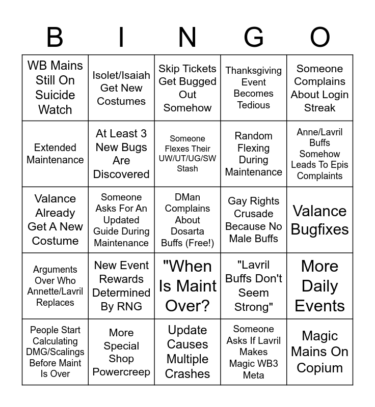 This bingo card has a free space and 24 words: New Event Rewards Determined By RNG, More Special Shop Powercreep, Someone Flexes Their UW/UT/UG/SW Stash, People Start Calculating DMG/Scalings Before Maint Is Over, Someone Complains About Login Streak, WB Mains Still On Suicide Watch, Extended Maintenance, Isolet/Isaiah Get New Costumes, Gay Rights Crusade Because No Male Buffs, "When Is Maint Over?, Random Flexing During Maintenance, Valance Already Get A New Costume, "Lavril Buffs Don't Seem Strong", More Daily Events, At Least 3 New Bugs Are Discovered, Someone Asks If Lavril Makes Magic WB3 Meta, Valance Bugfixes, Skip Tickets Get Bugged Out Somehow, Anne/Lavril Buffs Somehow Leads To Epis Complaints, Someone Asks For An Updated Guide During Maintenance, Magic Mains On Copium, Arguments Over Who Annette/Lavril Replaces, Thanksgiving Event Becomes Tedious and Update Causes Multiple Crashes.