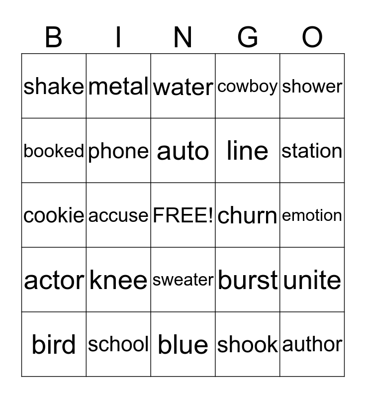 This bingo card has a free space and 24 words: knee, school, auto, bird, shower, shake, booked, metal, churn, sweater, line, cookie, burst, unite, phone, shook, emotion, water, station, accuse, author, actor, cowboy and blue.