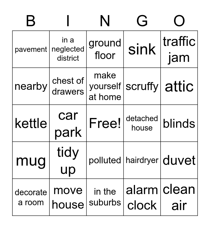 This bingo card has a free space and 24 words: tidy up, move house, make yourself at home, decorate a room, traffic jam, pavement, nearby, in a neglected district, detached house, polluted, scruffy, kettle, hairdryer, duvet, chest of drawers, alarm clock, blinds, ground floor, attic, car park, clean air, mug, sink and in the suburbs.