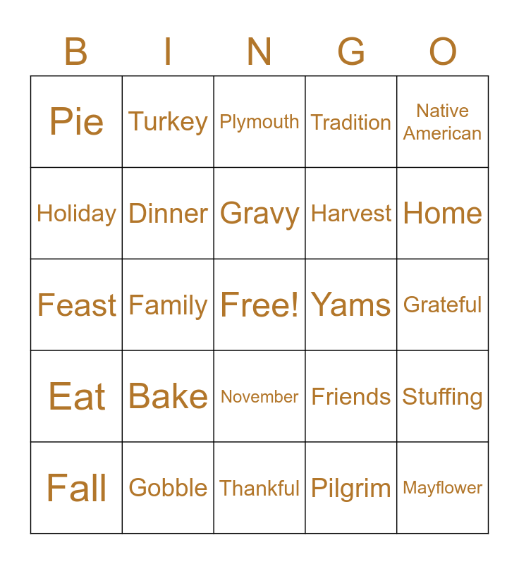 This bingo card has a free space and 24 words: Bake, Gobble, Gravy, Fall, Native American, Pie, Holiday, Turkey, Yams, November, Harvest, Feast, Friends, Stuffing, Dinner, Pilgrim, Grateful, Plymouth, Home, Family, Mayflower, Eat, Tradition and Thankful.