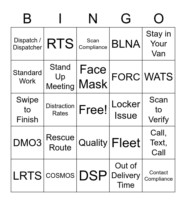 This bingo card has a free space and 71 words: Peak Bingo, RTS, Debrief, PNOV, DSP, ASPX, BLNA, FLAC, FORC, INFZ, LRTS, MAYD, WATS, Dispatch / Dispatcher, Rabbit, Swipe to Finish, Fleet, Stay in Your Van, Pre-Trip DVIC, Scan to Verify, Rescue Route, Contact Compliance, Call, Text, Call, 5 MPH, OTR, Missort, Business Closed, Unsafe Location, Unable to Access, Unable to Locate, COSMOS, Scorecard, FICO, Seat-belt, Out of Delivery Time, Peak Season, Post-Trip DVIC, Bad Weather, Standard Work, Customer Promise, Quality, Lost Prevention, DMO3, Customer Service, Voice of the Drivers, Safety Vest, Safety Gloves, Stand Up Meeting, Driver of the Month, Social Distancing, Jeff Bezos, Amazon Corporate, Locker Issue, Mind Your Steps – Zappos, Jedi, Staging Location, Face Mask, Itinerary, Peak is Coming (like the movie), TBA, Amazon Corporate, Delivered and Received, Distraction Rates, DFC, Marked Missing, Photo-On-Demand, Scan Compliance, Delivery Accuracy, Flex App, Oversized Box and Envelops/ Jiffys.