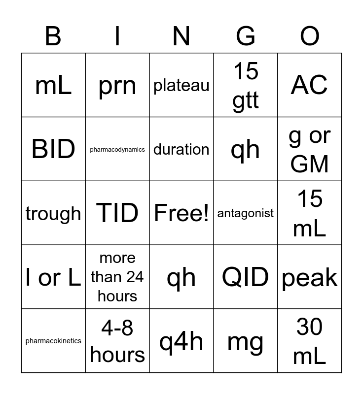 This bingo card has a free space and 37 words: TB syringe, q am, Phases of Pharmacokinetics, pharmacodynamics, peak, more than 24 hours, duration, Daily, AC, sublingual, TID, 15 gtt, 30 mL, 15 mL, BID, l or L, PC, plateau, qh, antagonist, mL, g or GM, pharmacokinetics, q4h, 5 mL, mg, prn, STAT, ad lib, partial agonist, agonist, 4-8 hours, trough, buccal, QID, qh and 0.5 mL.