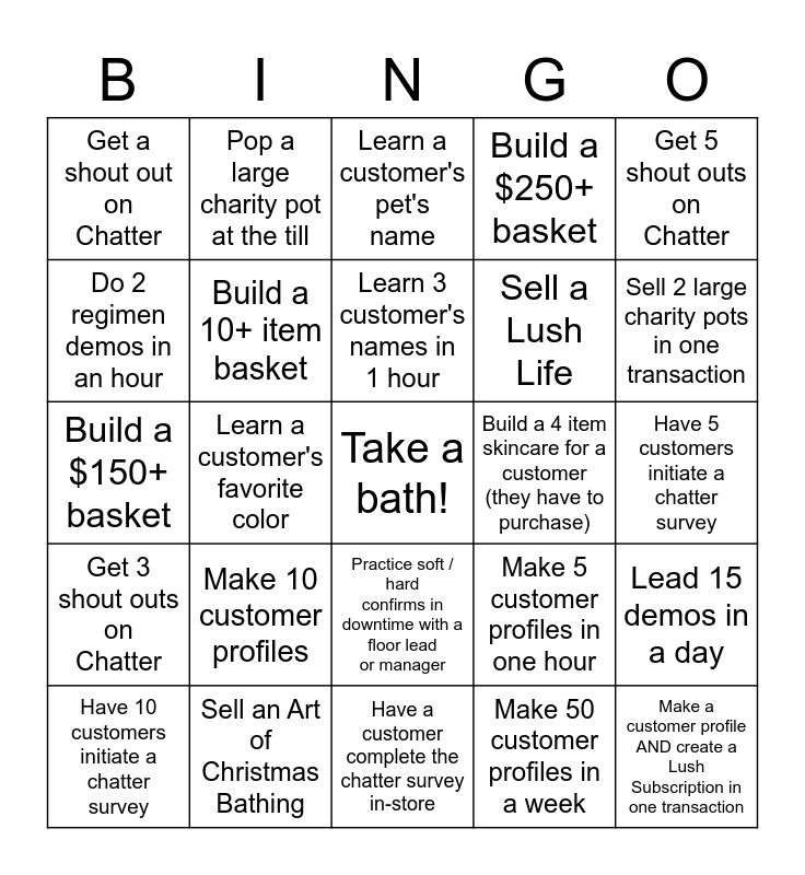 This bingo card has a free space and 24 words: Make 10 customer profiles, Sell an Art of Christmas Bathing, Learn 3 customer's names in 1 hour, Have 10 customers initiate a chatter survey, Get 5 shout outs on Chatter, Get a shout out on Chatter, Do 2 regimen demos in an hour, Pop a large charity pot at the till, Build a 4 item skincare for a customer (they have to purchase), Practice soft / hard confirms in downtime with a floor lead or manager, Sell a Lush Life, Build a $150+ basket, Make 5 customer profiles in one hour, Lead 15 demos in a day, Build a 10+ item basket, Make 50 customer profiles in a week, Have 5 customers initiate a chatter survey, Learn a customer's pet's name, Sell 2 large charity pots in one transaction, Learn a customer's favorite color, Make a customer profile AND create a Lush Subscription in one transaction, Get 3 shout outs on Chatter, Build a $250+ basket and Have a customer complete the chatter survey in-store.