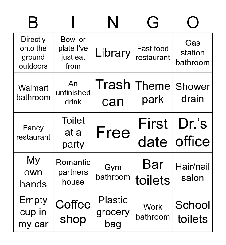 This bingo card has a free space and 24 words: Romantic partners house, Coffee shop, Trash can, Empty cup in my car, Gas station bathroom, Directly onto the ground outdoors, Walmart bathroom, Bowl or plate I’ve just eat from, First date, Gym bathroom, Theme park, Fancy restaurant, Bar toilets, Hair/nail salon, An unfinished drink, Work bathroom, Dr.’s office, Library, Shower drain, Toilet at a party, School toilets, My own hands, Fast food restaurant and Plastic grocery bag.