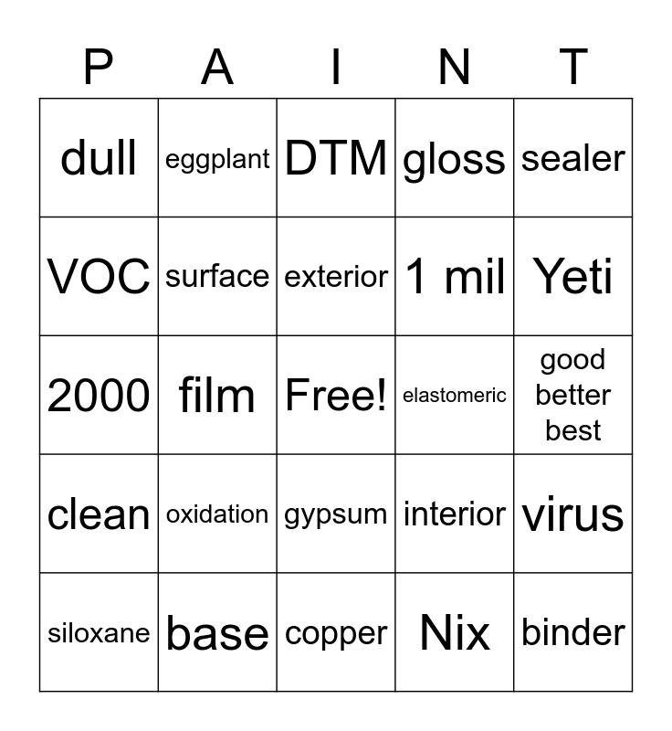 This bingo card has a free space and 52 words: Glidden, binder, DFT, copper, oxidation, LRV, eggplant, primer, VOC, ply, surface, quats, virus, interior, skid, baby powder, exterior, elastomeric, dry, sealer, film, Nix, dull, 1 mil, technology, color, zinc, bacteria, Yeti, 2025, pigment, gloss, hue, chroma, solvent, DTM, base, professionals, additive, sheen, silver, good better best, clean, plate, gypsum, glue, coalescence, 2000, CDC, value, siloxane and fluropolymer.