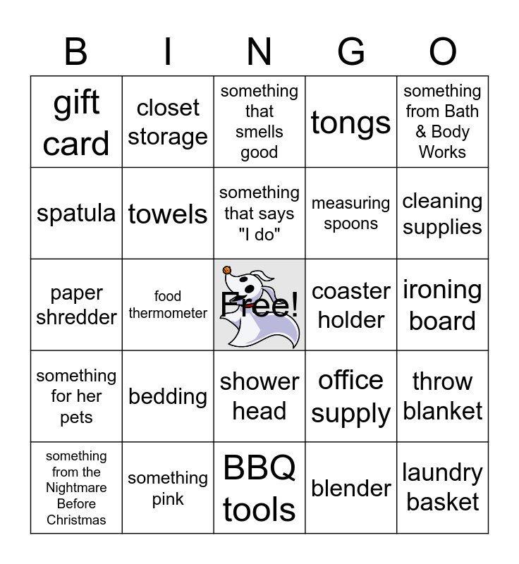 This bingo card has a free space and 24 words: bedding, something pink, something that says "I do", something from the Nightmare Before Christmas, something from Bath & Body Works, gift card, spatula, closet storage, coaster holder, shower head, measuring spoons, paper shredder, office supply, throw blanket, towels, blender, ironing board, something that smells good, cleaning supplies, food thermometer, laundry basket, something for her pets, tongs and BBQ tools.