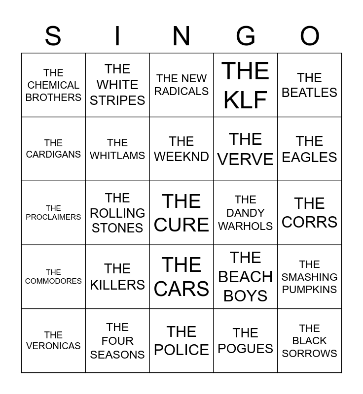 This bingo card has 25 words: THE KILLERS, THE POLICE, THE WEEKND, THE VERONICAS, THE BEATLES, THE CHEMICAL BROTHERS, THE CARDIGANS, THE WHITE STRIPES, THE DANDY WARHOLS, THE CARS, THE VERVE, THE PROCLAIMERS, THE BEACH BOYS, THE SMASHING PUMPKINS, THE WHITLAMS, THE BLACK SORROWS, THE CORRS, THE NEW RADICALS, THE EAGLES, THE ROLLING STONES, THE CURE, THE FOUR SEASONS, THE COMMODORES, THE KLF and THE POGUES.