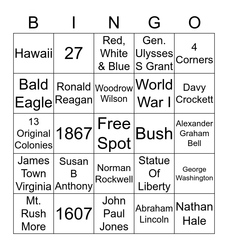 This bingo card has a free space and 24 words: Susan B Anthony, 1607, Woodrow Wilson, Mt. Rush More, 4 Corners, Hawaii, Bald Eagle, 27, Bush, Norman Rockwell, World War I, 13 Original Colonies, Statue Of Liberty, George Washington, Ronald Reagan, Abraham Lincoln, Alexander Graham Bell, Red, White & Blue, Davy Crockett, 1867, Nathan Hale, James Town Virginia, Gen. Ulysses S Grant and John Paul Jones.