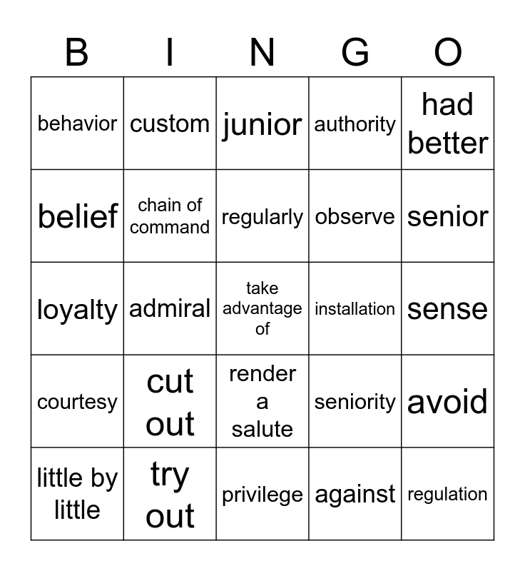 This bingo card has a free space and 24 words: cut out, try out, regularly, little by little, had better, behavior, belief, custom, installation, render a salute, observe, loyalty, seniority, avoid, chain of command, against, sense, junior, senior, admiral, regulation, courtesy, authority and privilege.
