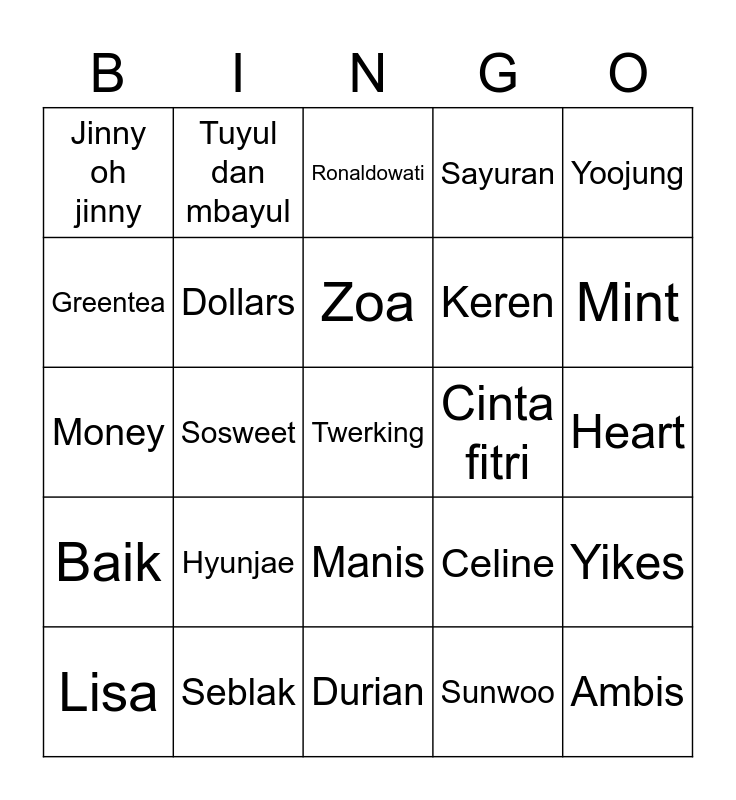 This bingo card has a free space and 24 words: Lisa, Hyunjae, Zoa, Sunwoo, Yoojung, Jinny oh jinny, Tuyul dan mbayul, Ronaldowati, Cinta fitri, Heart, Money, Dollars, Celine, Yikes, Greentea, Seblak, Durian, Sayuran, Mint, Baik, Sosweet, Manis, Keren and Ambis.