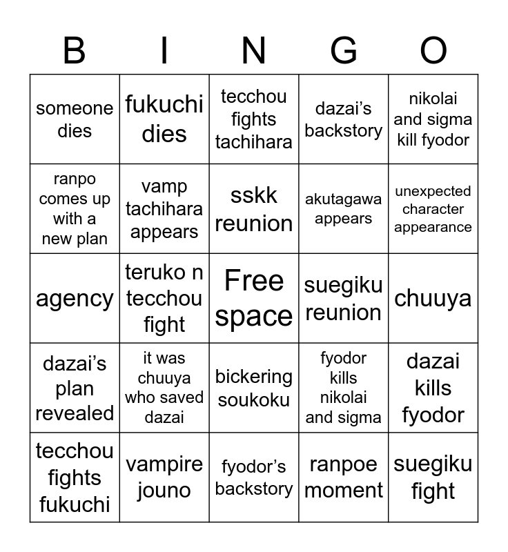 This bingo card has a free space and 24 words: it was chuuya who saved dazai, vampire jouno, sskk reunion, tecchou fights fukuchi, nikolai and sigma kill fyodor, someone dies, ranpo comes up with a new plan, fukuchi dies, suegiku reunion, bickering soukoku, akutagawa appears, agency, fyodor kills nikolai and sigma, dazai kills fyodor, vamp tachihara appears, ranpoe moment, chuuya, tecchou fights tachihara, unexpected character appearance, teruko n tecchou fight, suegiku fight, dazai’s plan revealed, dazai’s backstory and fyodor’s backstory.