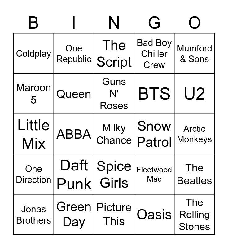 This bingo card has a free space and 24 words: Daft Punk, Green Day, Guns N' Roses, Jonas Brothers, Mumford & Sons, Coldplay, Maroon 5, One Republic, Snow Patrol, Spice Girls, BTS, Little Mix, Fleetwood Mac, The Beatles, Queen, Oasis, Arctic Monkeys, The Script, U2, ABBA, The Rolling Stones, One Direction, Bad Boy Chiller Crew and Picture This.