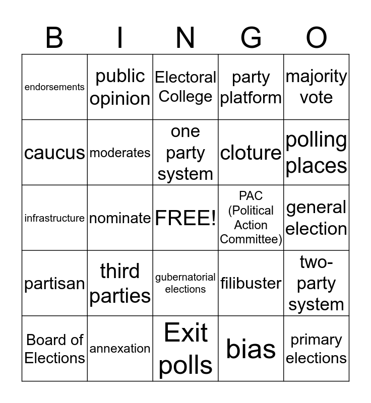 This bingo card has a free space and 37 words: political parties, Republicans, Democrats, moderates, two-party system, third parties, one party system, plurality vote, majority vote, coalitions, nominate, party platform, primary elections, general election, caucus, partisan, non-partisan, Electoral College, gubernatorial elections, PAC (Political Action Committee), endorsements, polling places, Board of Elections, Exit polls, mass media, bias, public opinion, political activism, special interest groups, lobbyists, zoning laws, annexation, infrastructure, standing committee, filibuster, cloture and pocket veto.