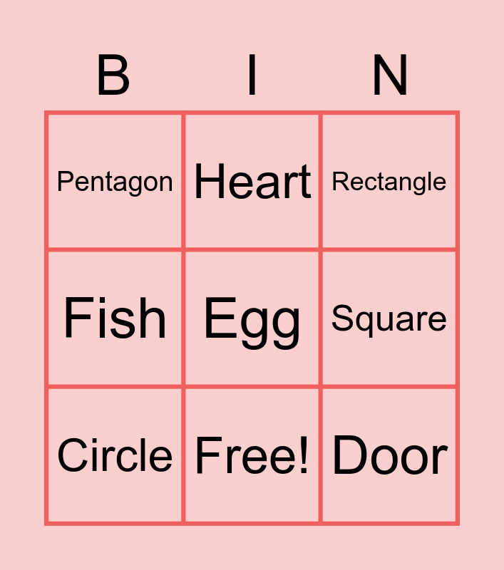 This bingo card has 18 words: Circle, Diamond, Rectangle, Pentagon, Free!, Square, Triangle, Heart, Oval, Fish, Hexagon, Door, Octagon, Egg, Octopus, Star, Parallelogram and Trapezoid.