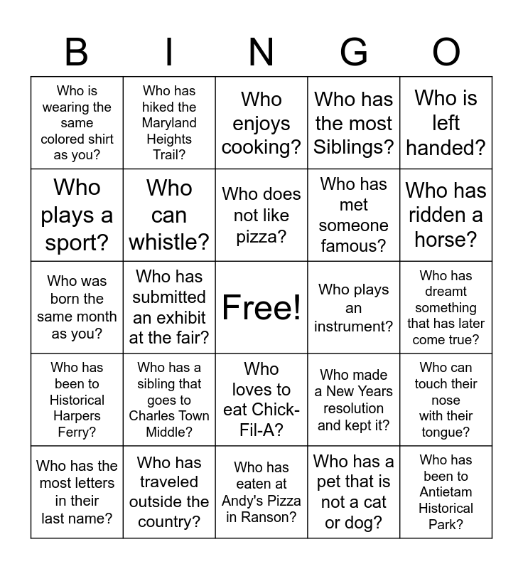 This bingo card has a free space and 24 words: Who has a sibling that goes to Charles Town Middle?, Who has traveled outside the country?, Who does not like pizza?, Who has the most letters in their last name?, Who is left handed?, Who is wearing the same colored shirt as you?, Who plays a sport?, Who has hiked the Maryland Heights Trail?, Who plays an instrument?, Who loves to eat Chick-Fil-A?, Who has met someone famous?, Who was born the same month as you?, Who made a New Years resolution and kept it?, Who can touch their nose with their tongue?, Who can whistle?, Who has a pet that is not a cat or dog?, Who has dreamt something that has later come true?, Who enjoys cooking?, Who has ridden a horse?, Who has submitted an exhibit at the fair?, Who has been to Antietam Historical Park?, Who has been to Historical Harpers Ferry?, Who has the most Siblings? and Who has eaten at Andy's Pizza in Ranson?.