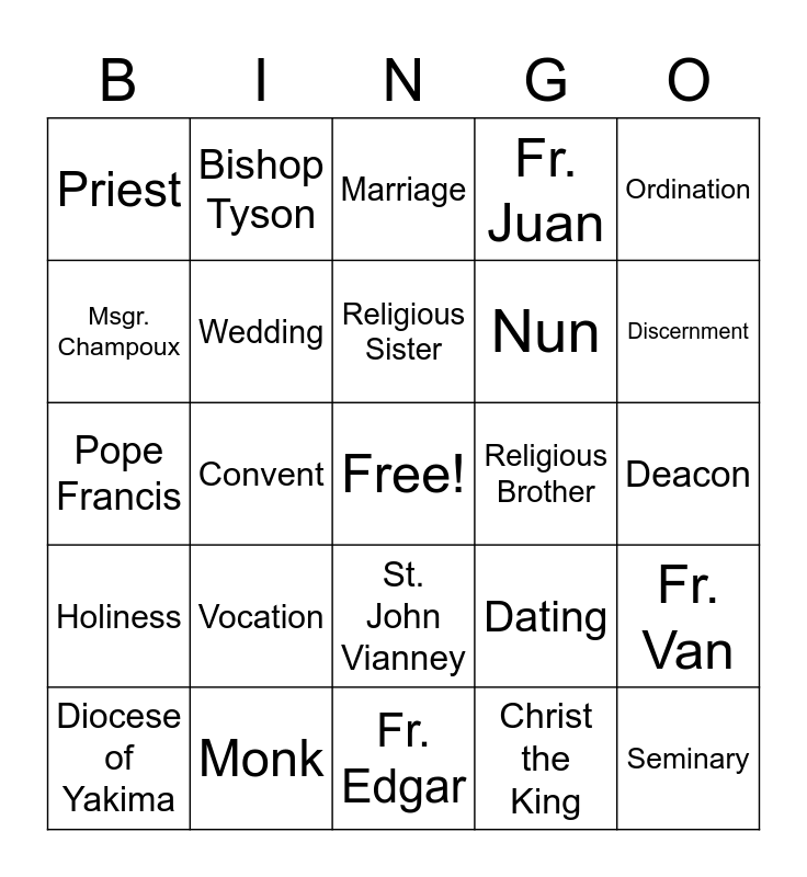 This bingo card has a free space and 24 words: Vocation, Monk, Religious Sister, Diocese of Yakima, Ordination, Priest, Msgr. Champoux, Bishop Tyson, Religious Brother, St. John Vianney, Nun, Pope Francis, Dating, Fr. Van, Wedding, Christ the King, Deacon, Marriage, Discernment, Convent, Seminary, Holiness, Fr. Juan and Fr. Edgar.