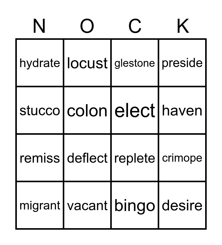 This bingo card has 20 words: crimope, restrimp, glestone, trymest, migrant, stucco, vacant, hydrate, remiss, locust, deflect, replete, colon, desire, elect, amen, haven, preside, bingo and comic.