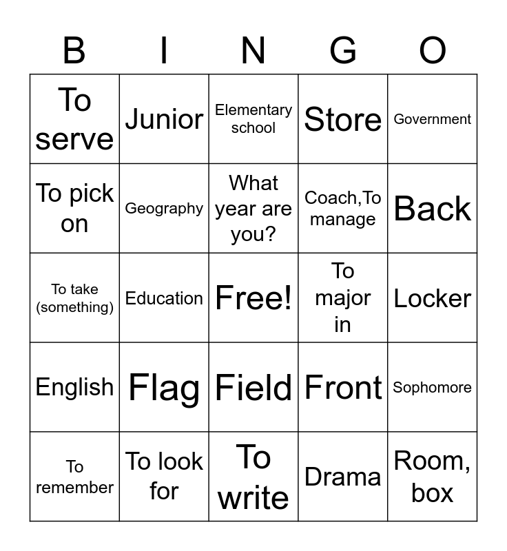 This bingo card has a free space and 32 words: Drama, Economics, Education, Engineering, English, Geography, Government, Sophomore, Junior, Senior, What year are you?, Elementary school, To forget, Junior high School, To major in, Middle school, To remember, To take (something), Field, Flag, Front, Snack Machine, Locker, To look for, Room, box, Store, Coach,To manage, To pick on, To serve, To write, Activity center and Back.