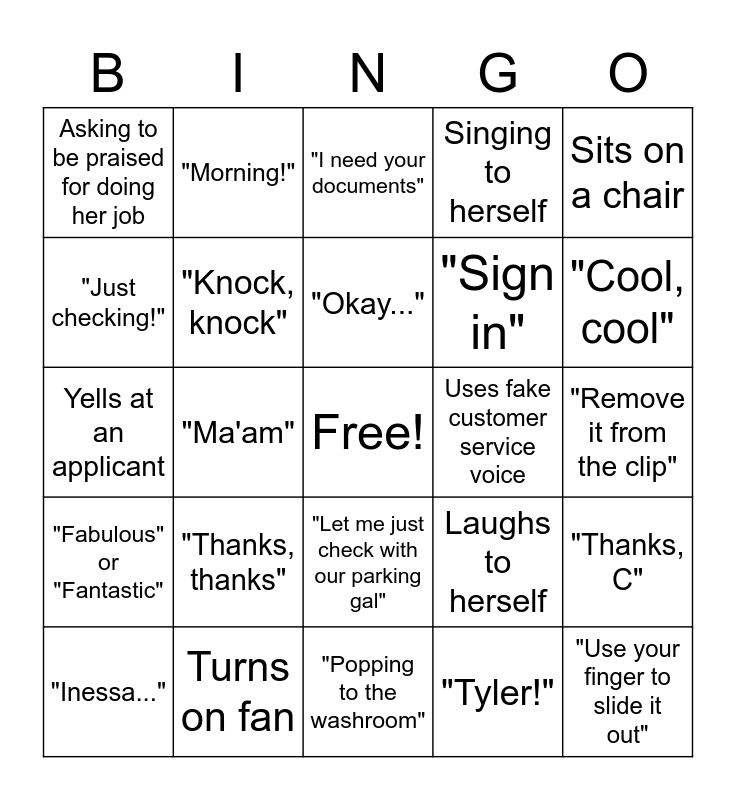 This bingo card has a free space and 24 words: "Thanks, thanks", Turns on fan, "Okay...", "Inessa...", Sits on a chair, Asking to be praised for doing her job, "Just checking!", "Morning!", Uses fake customer service voice, "Let me just check with our parking gal", "Sign in", Yells at an applicant, Laughs to herself, "Thanks, C", "Knock, knock", "Tyler!", "Remove it from the clip", "I need your documents", "Cool, cool", "Ma'am", "Use your finger to slide it out", "Fabulous" or "Fantastic", Singing to herself and "Popping to the washroom".