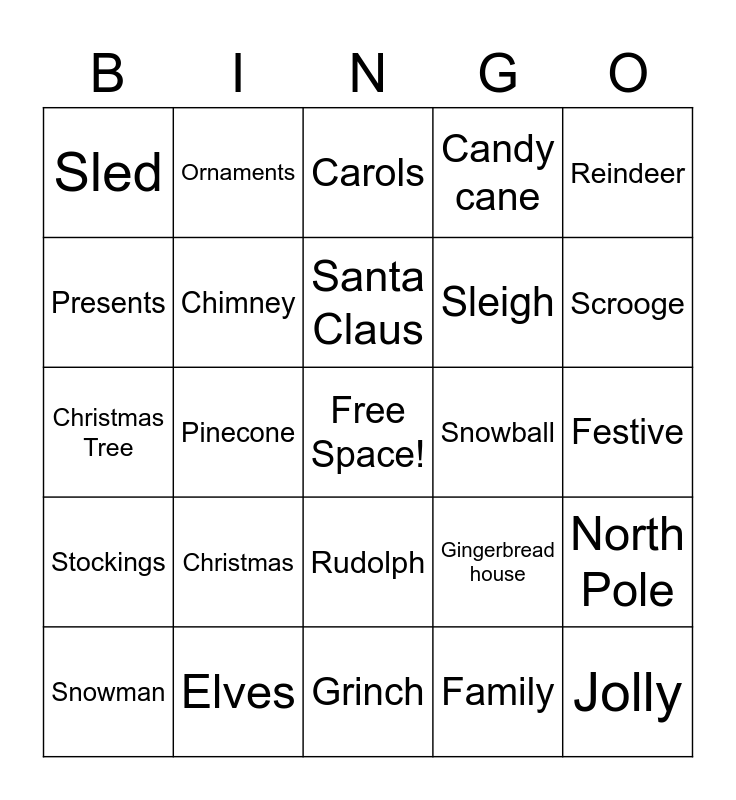 This bingo card has a free space and 24 words: Christmas, Elves, Santa Claus, Snowman, Reindeer, Sled, Presents, Ornaments, Snowball, Rudolph, Sleigh, Christmas Tree, Gingerbread house, North Pole, Chimney, Family, Festive, Carols, Scrooge, Pinecone, Jolly, Stockings, Candy cane and Grinch.