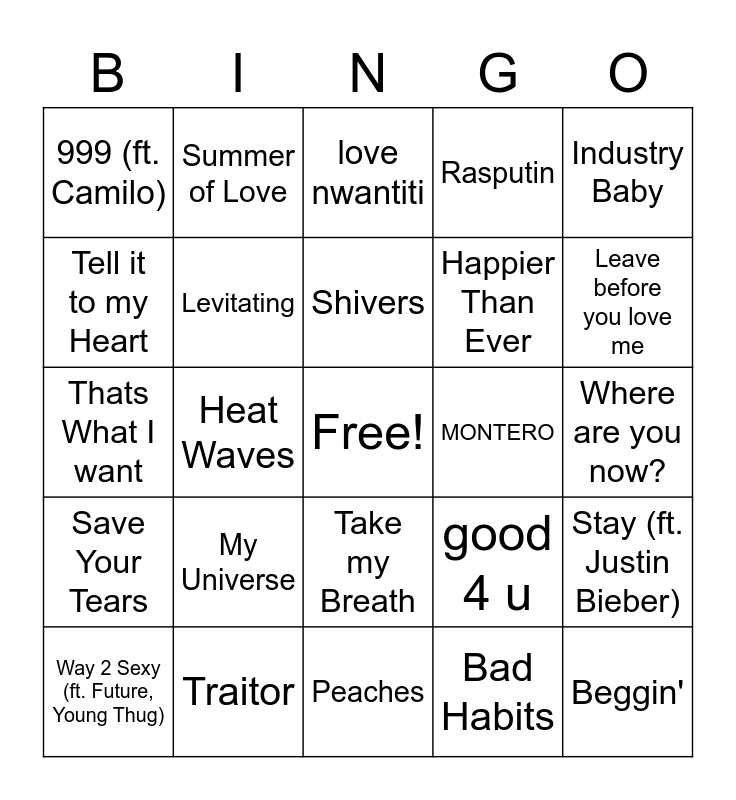 This bingo card has a free space and 42 words: Easy on Me, Shivers, Cold Heart, My Universe, Bad Habits, Stay (ft. Justin Bieber), Beggin', Moth to a Flame, love nwantiti, Take my Breath, Where are you now?, Leave before you love me, Heat Waves, Industry Baby, Ghost, good 4 u, Love Again, Thats What I want, Cover Me in Sunshine, Summer of Love, Tell it to my Heart, Hurricane, Acapulco, 999 (ft. Camilo), SG (ft. Ozuna, Megan the Stallion, LISA & BLACKPINK), Don't Go Yet, Happier Than Ever, Rumors (ft. Cardi), Kiss me more, Butter, Need to Know, Save Your Tears, Levitating, Peaches, Leave the door open, Way 2 Sexy (ft. Future, Young Thug), Traitor, MONTERO, Beautiful Mistakes, Astronaut in the Ocean, Rasputin and Friday.
