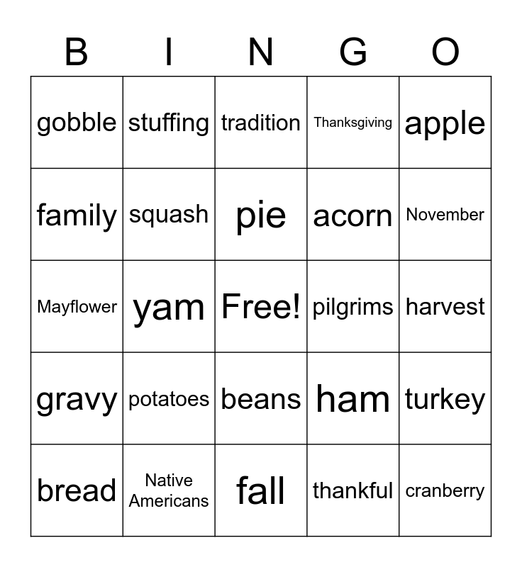 This bingo card has a free space and 24 words: potatoes, Native Americans, pie, bread, apple, gobble, family, stuffing, pilgrims, beans, acorn, Mayflower, ham, turkey, squash, thankful, harvest, tradition, November, yam, cranberry, gravy, Thanksgiving and fall.