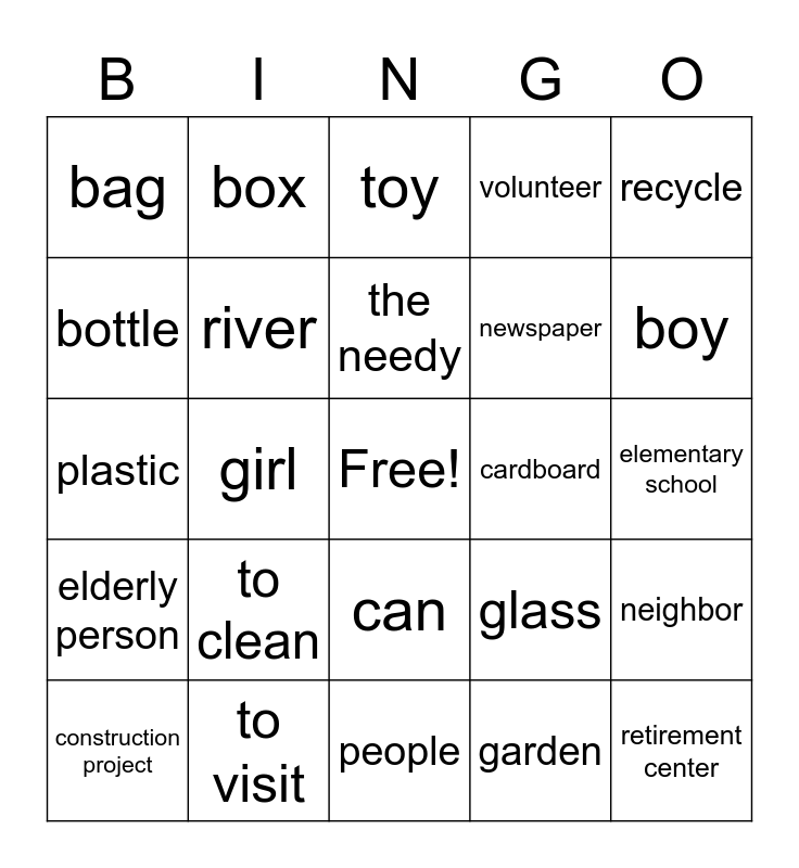 This bingo card has a free space and 24 words: to clean, to visit, the needy, construction project, recycle, bag, bottle, box, cardboard, can, newspaper, plastic, glass, neighbor, river, garden, elementary school, toy, boy, girl, retirement center, elderly person, volunteer and people.