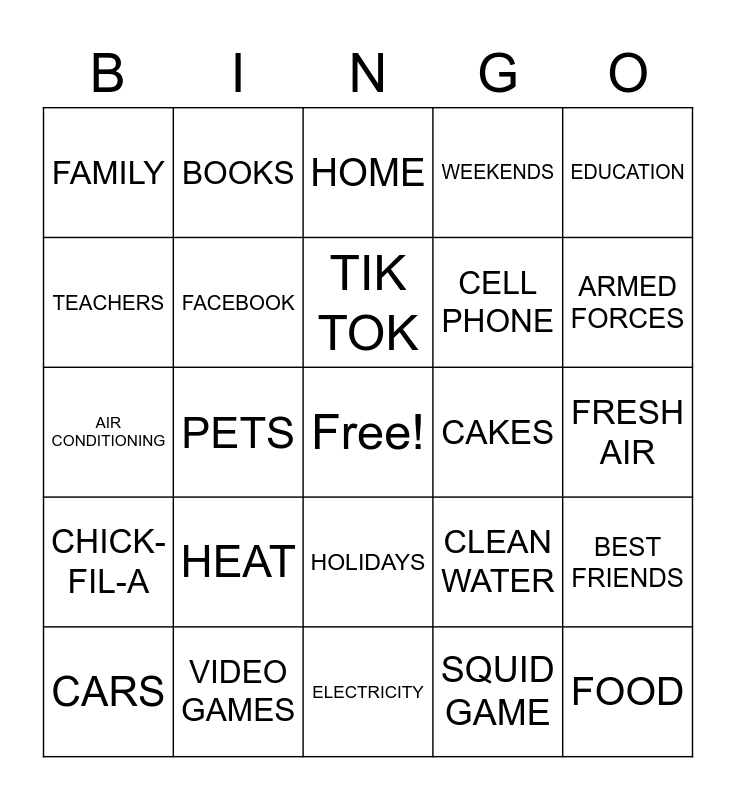 This bingo card has a free space and 34 words: NETFLIX, SQUID GAME, INSTAGRAM, QUALITY TIME, CHICK-FIL-A, FACEBOOK, EDUCATION, CARS, BOOKS, MUSIC, TIK TOK, HOME, LOVE, SPORTS, CAKES, ARMED FORCES, VIDEO GAMES, AIR CONDITIONING, HEAT, CLEAN WATER, HOLIDAYS, INTERNET, FAMILY, FRESH AIR, ELECTRICITY, FOOD, WEEKENDS, SLEEP, CELL PHONE, TEACHERS, CLOTHING, PETS, BEST FRIENDS and HEATLH.