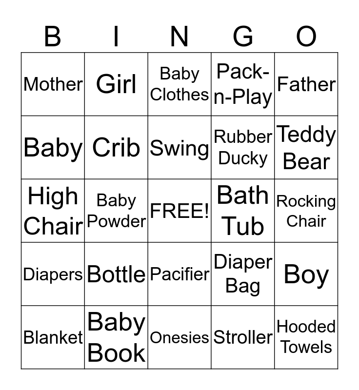 This bingo card has a free space and 24 words: Bottle, Baby Book, Swing, Blanket, Father, Mother, Baby, Girl, Bath Tub, Pacifier, Rubber Ducky, High Chair, Diaper Bag, Boy, Crib, Stroller, Rocking Chair, Baby Clothes, Teddy Bear, Baby Powder, Hooded Towels, Diapers, Pack-n-Play and Onesies.