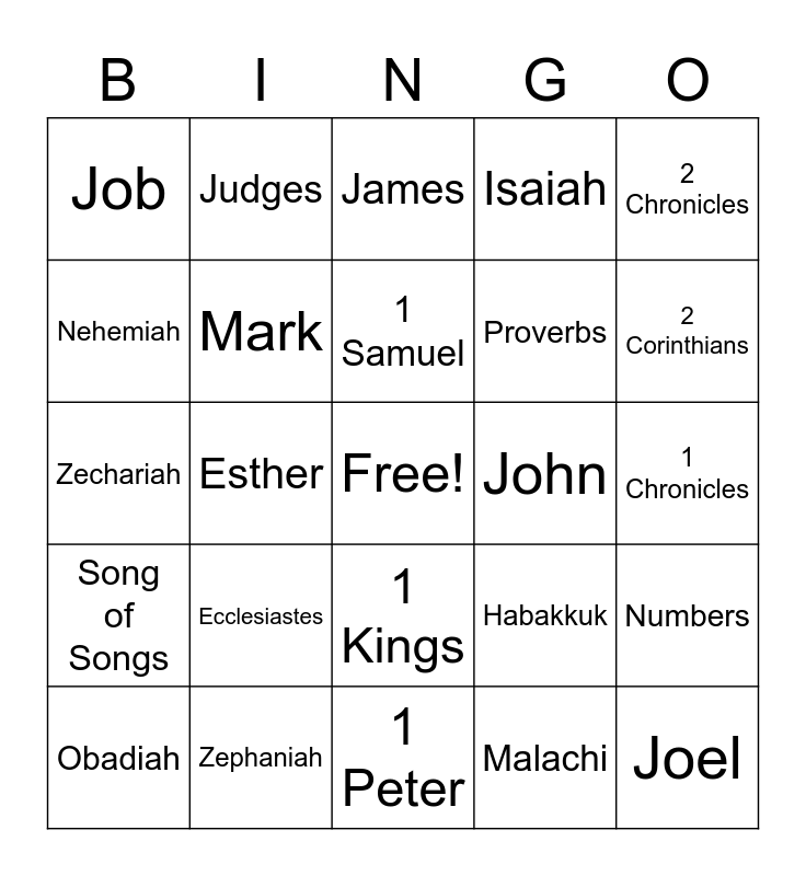 This bingo card has a free space and 66 words: Genesis, Exodus, Leviticus, Numbers, Deuteronomy, Joshua, Judges, Ruth, 1 Samuel, 2 Samuel, 1 Kings, 2 Kings, 1 Chronicles, 2 Chronicles, Ezra, Nehemiah, Esther, Job, Psalms, Proverbs, Ecclesiastes, Song of Songs, Isaiah, Jeremiah, Lamentations, Ezekiel, Daniel, Hosea, Joel, Amos, Obadiah, Jonah, Micah, Nahum, Habakkuk, Zephaniah, Haggai, Zechariah, Malachi, Matthew, Mark, Luke, John, Acts, Romans, 1 Corinthians, 2 Corinthians, Galatians, Ephesians, Philippians, Colossians, 1 Thessalonians, 2 Thessalonians, 1 Timothy, 2 Timothy, Titus, Philemon, Hebrews, James, 1 Peter, 2 Peter, 1 John, 2 John, 3 John, Jude and Revelations.
