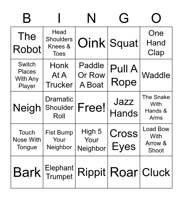 This bingo card has a free space and 45 words: Quack, Cluck, Bray, Bark, Meow, Roar, Oink, Snort, One Hand Clap, Elephant Trumpet, Squat, Jazz Hands, High 5 Your Neighbor, Fist Bump Your Neighbor, Jumping Jack, Rippit, Bleat, Neigh, Flap, Waddle, Head Shoulders Knees & Toes, Flamingo Stand, Bow Karate Chop Bow, The Robot, Bow Right Left Center, The Snake With Hands & Arms, Start The Car & Drive Use Turn Signal, Pat Head Rub Stomach, Cross Eyes, Touch Nose With Tongue, Wiggle Ears, Load Bow With Arrow & Shoot, 2 Gun Quick Draw Bang Bang Spin Blow Smoke Place In Holster, Ride A Horse & Lasso A Calf, Climb A Ladder, Dramatic Shoulder Roll, Raise Your Eyebrows, Slow Wink, Spin, Flip & Catch A Pizza, Paddle Or Row A Boat, Switch Places With Any Player, Pull A Rope, Peacefully Remove Marker From Any Player, Honk At A Trucker and Taco Tongue & Wink.