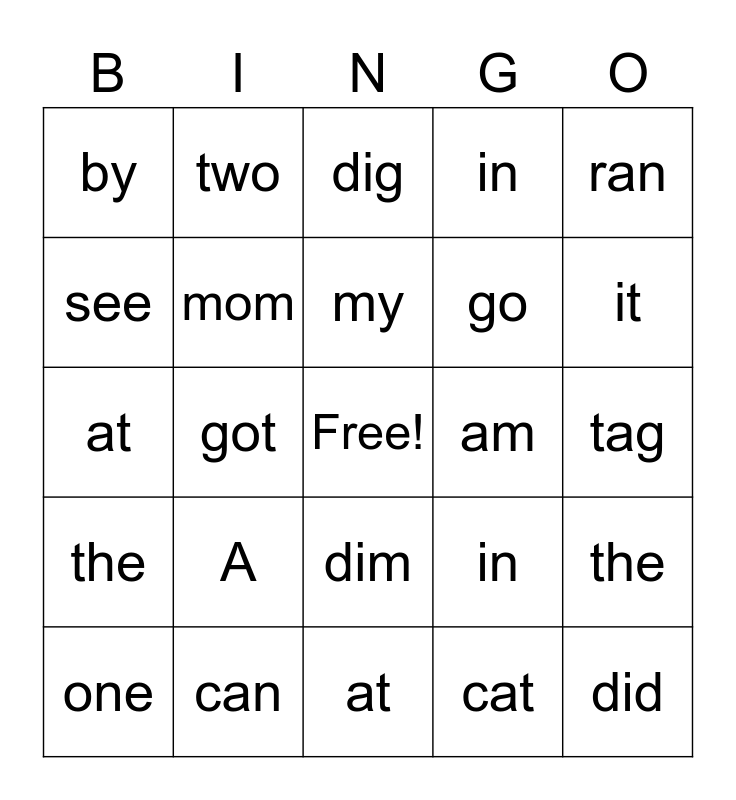 This bingo card has a free space and 24 words: A, can, my, one, ran, by, see, two, am, dim, go, at, in, the, mom, cat, tag, dig, it, got, did, the, in and at.