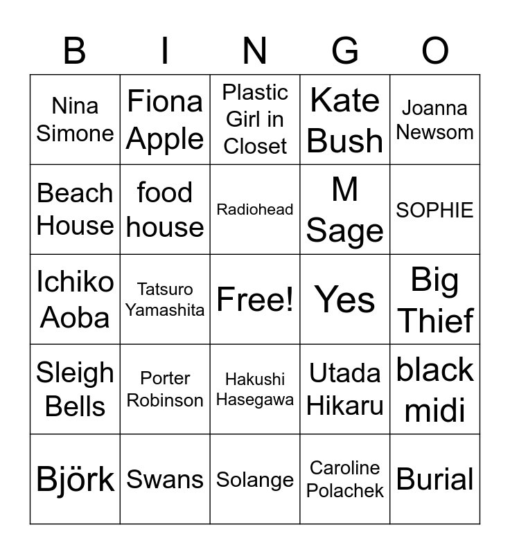 This bingo card has a free space and 24 words: Porter Robinson, Swans, Radiohead, Björk, Joanna Newsom, Nina Simone, Beach House, Fiona Apple, Yes, Hakushi Hasegawa, M Sage, Ichiko Aoba, Utada Hikaru, black midi, food house, Caroline Polachek, Big Thief, Plastic Girl in Closet, SOPHIE, Tatsuro Yamashita, Burial, Sleigh Bells, Kate Bush and Solange.