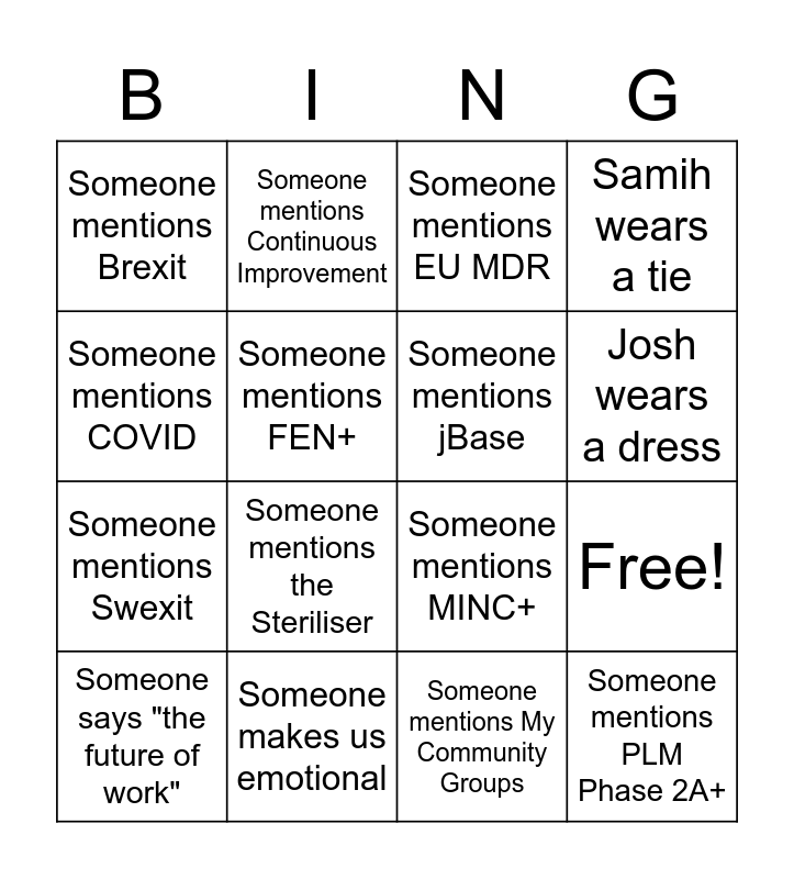 This bingo card has 20 words: Free!, Cookie makes an appearance, Someone mentions EU MDR, Pete makes an appearance, Someone says "the future of work", Someone mentions COVID, Someone makes us emotional, Someone mentions Brexit, Someone mentions Swexit, Someone mentions Continuous Improvement, Someone mentions the Steriliser, Someone mentions MINC+, Someone mentions FEN+, Someone mentions PLM Phase 2A+, Someone mentions jBase, Someone mentions CAMS, Josh wears a dress, Samih wears a tie, Someone mentions My Community Groups and Waiting music are bangers.
