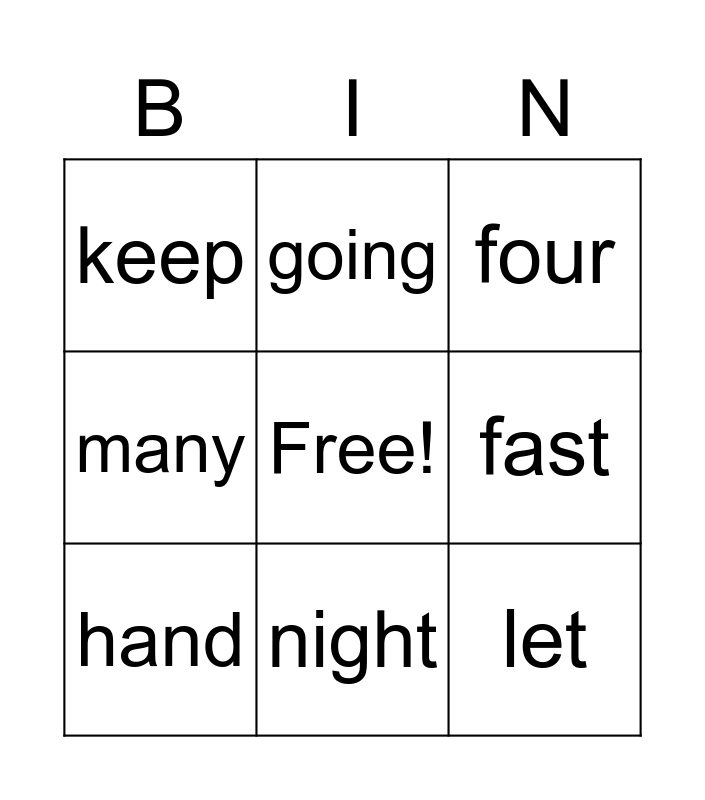 This bingo card has a free space and 8 words: fast, four, going, hand, keep, let, many and night.