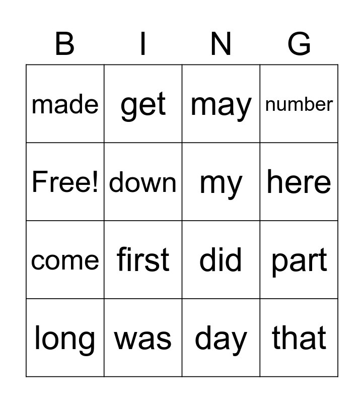 This bingo card has 16 words: was, part, may, made, come, get, did, day, Free!, down, long, number, first, here, my and that.