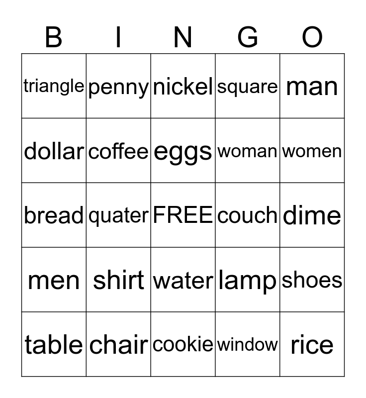 This bingo card has a free space and 24 words: shirt, chair, eggs, table, man, triangle, dollar, penny, couch, water, woman, bread, lamp, shoes, coffee, window, dime, nickel, women, quater, rice, men, square and cookie.
